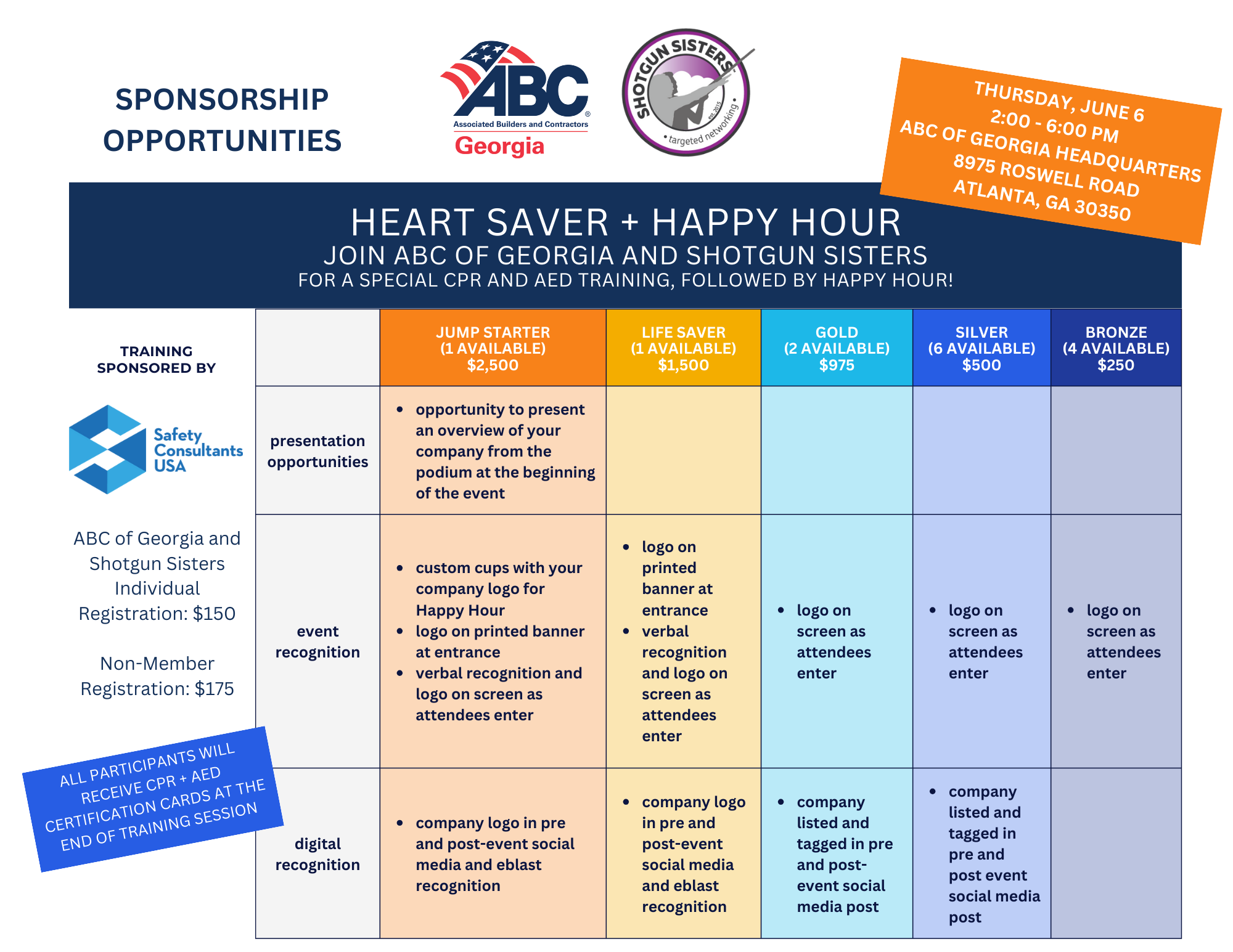Join Shotgun Sisters and ABC of Georgia for a joint educational and happy hour event! The afternoon will begin with an important session on learning life-saving CPR and AED skills from Safety Consultants USA. All participants will leave the training with an official CPR/AED training card. There will be a happy hour featuring light bites and drinks following the training.
